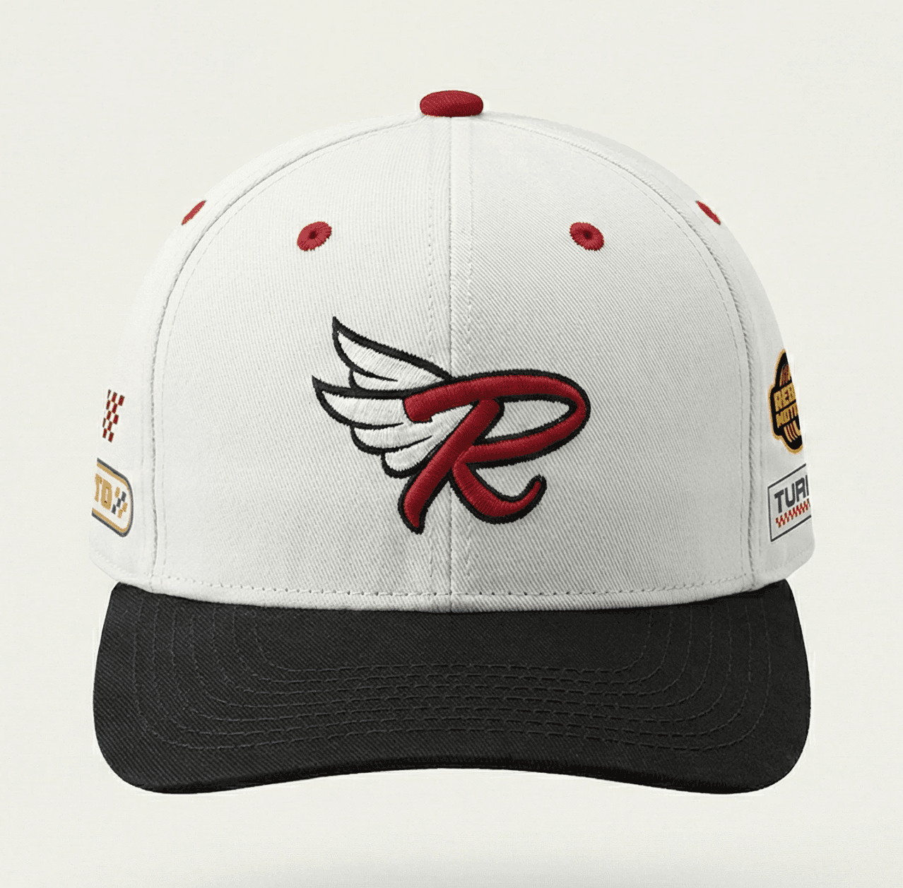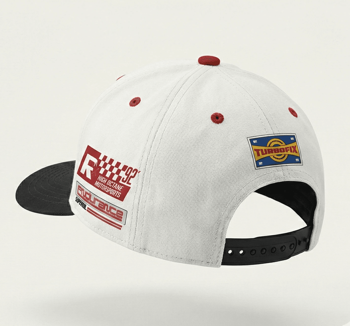 6 Panel Snapback with racer embroidery and prints.