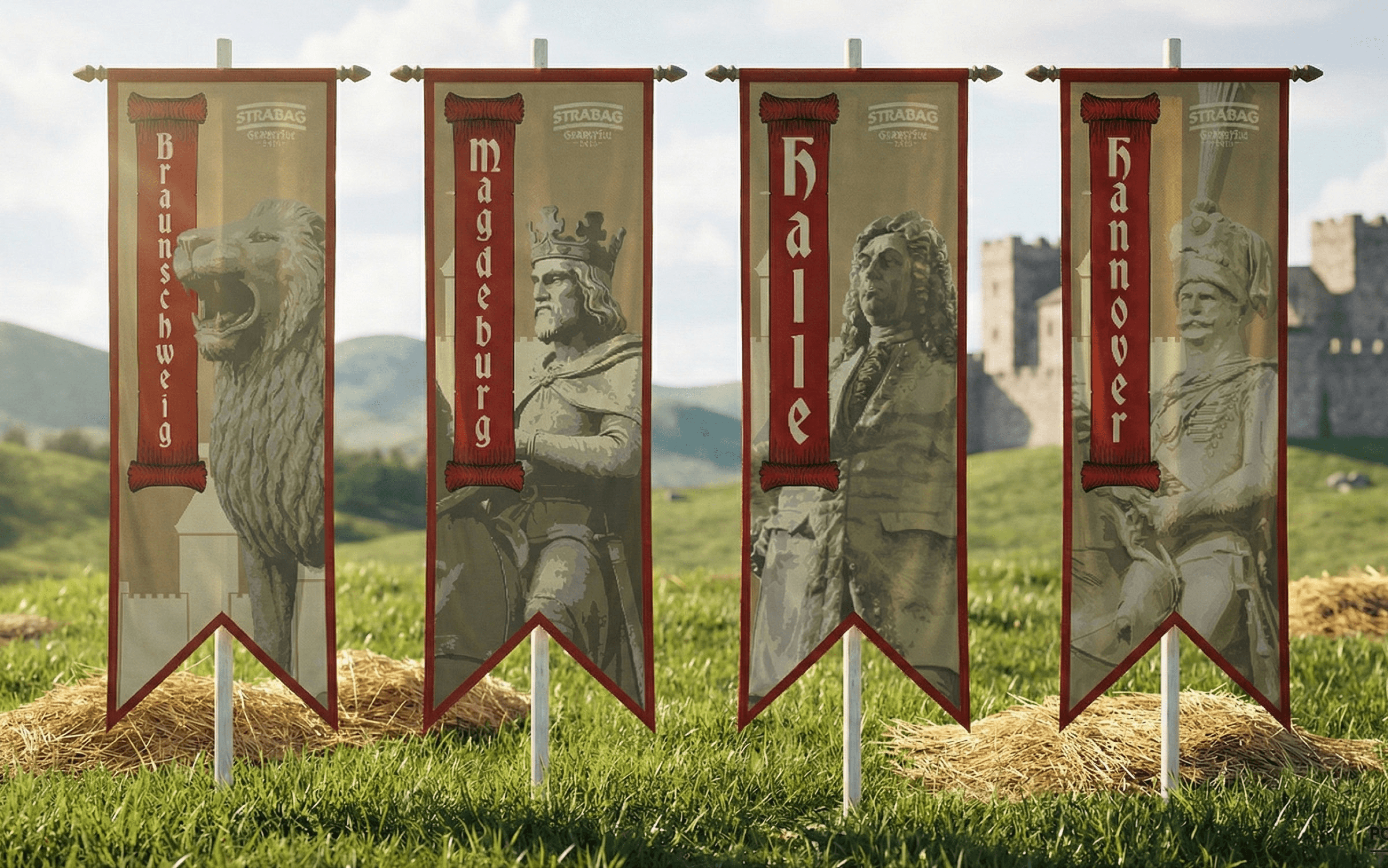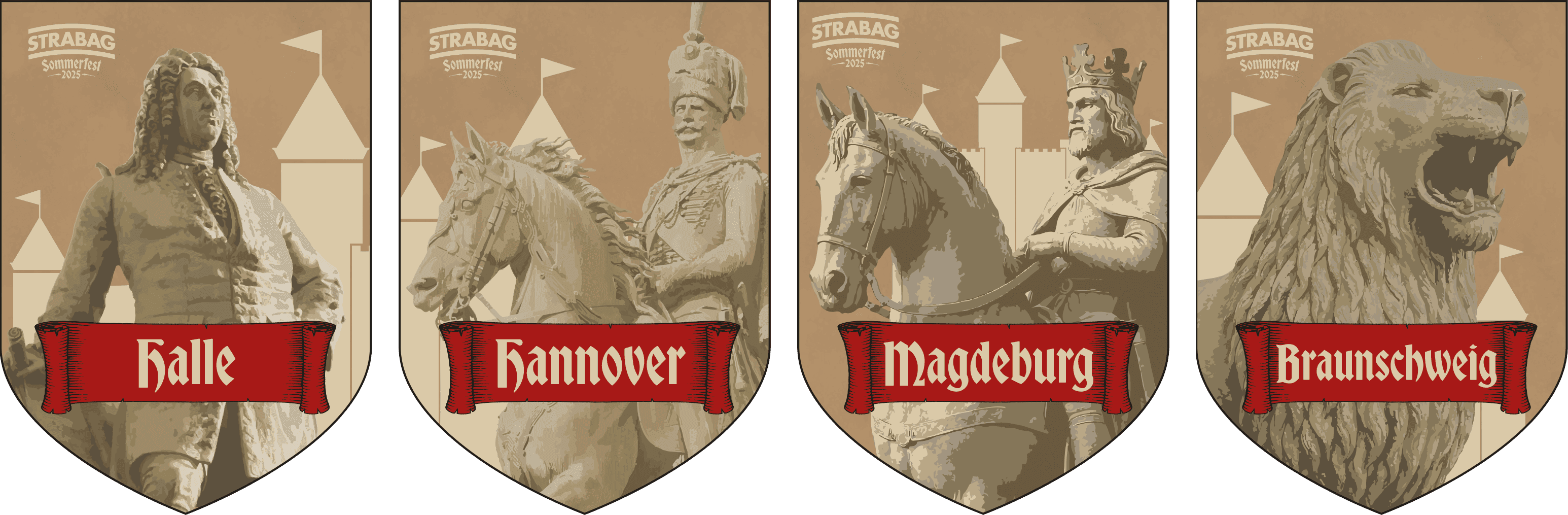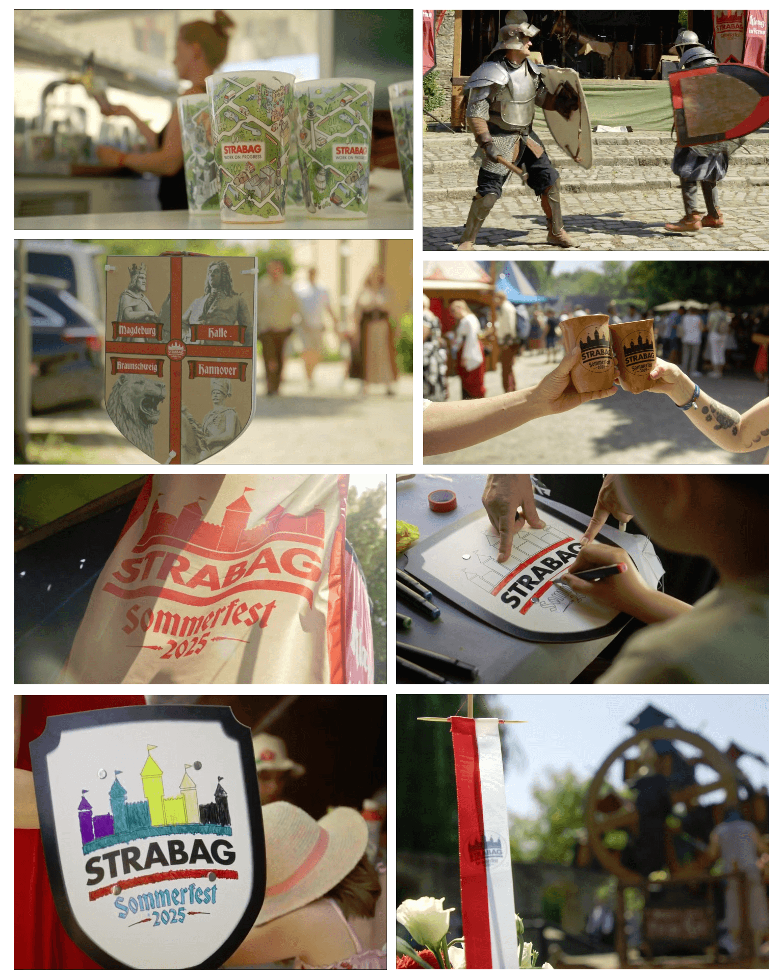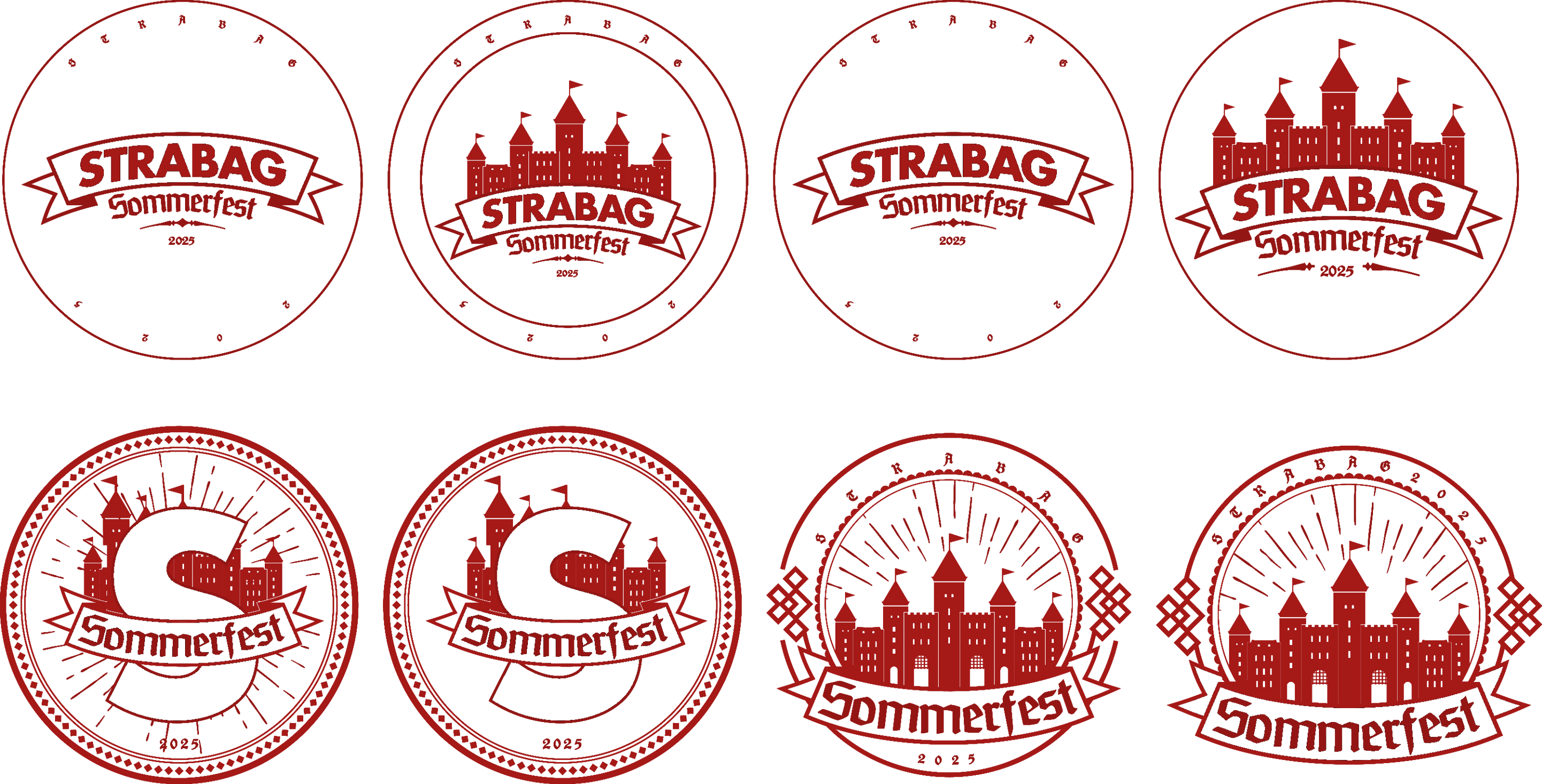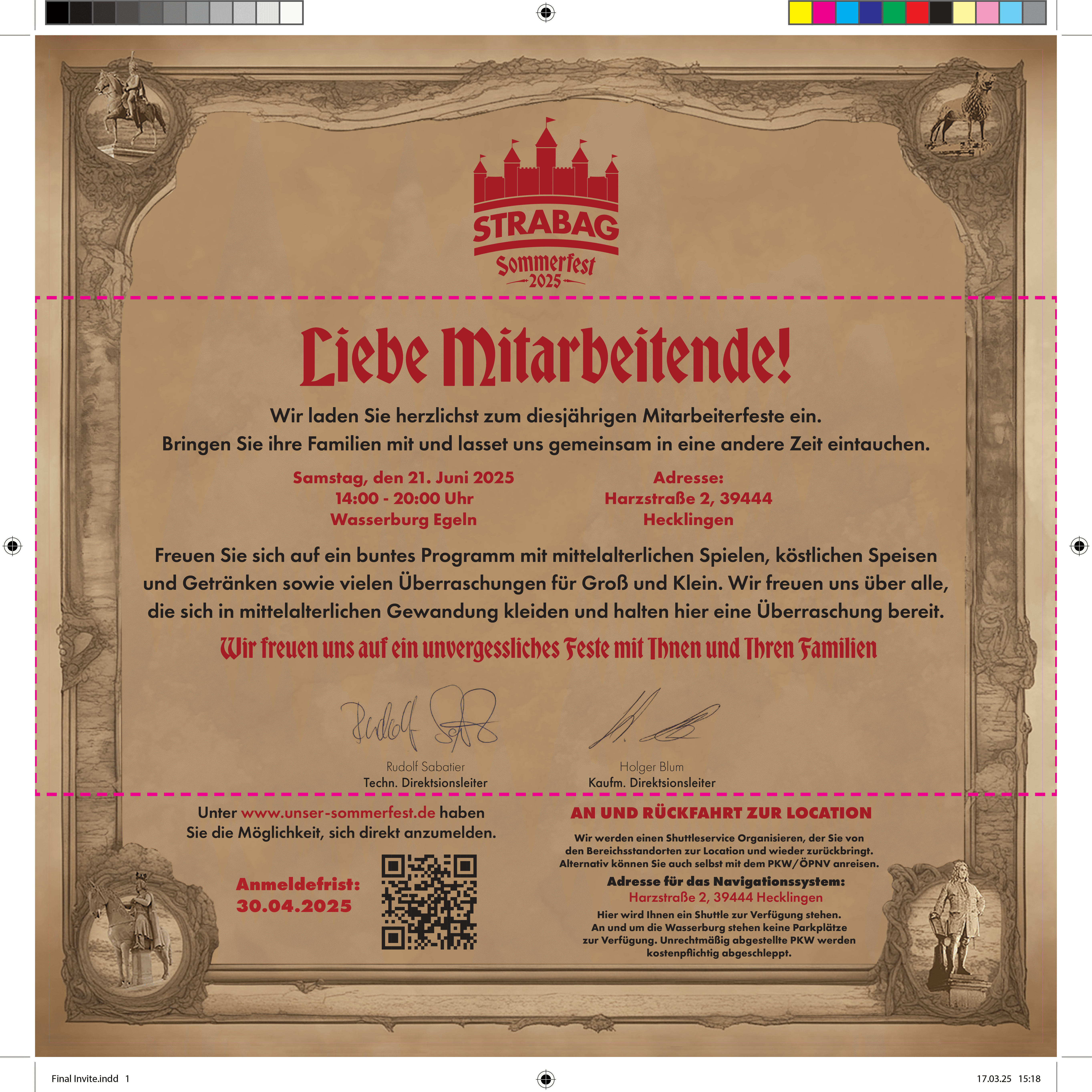 Created the full visual identity of the Strabag 2025 annual 'Sommerfest' summer party. Assets ranged from the design of the invitation and wax seals to large printed textile flags, colouring sheets, banners, and more. Maintaining strict adherence to the corporate identity guidelines, the final output incorporated Strabag's corporate identity harmoniously into the 'Medieval Fayre' theme.